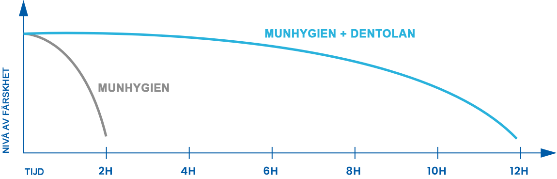 Som grafen visar ger Dentolan i kombination med munhygien en mycket längre friskhetseffekt jämfört med enbart munhygien.